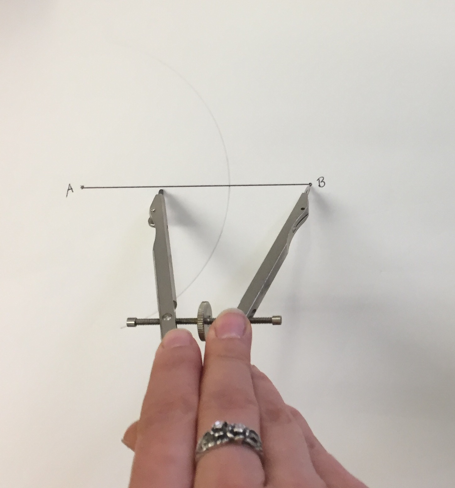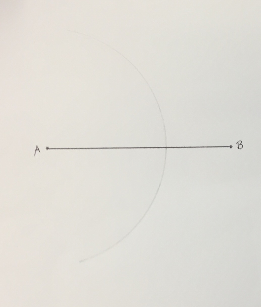 Today we’ll be doing a very simple construction — bisecting a segment. Â In other words, we will be cutting a line segment in half. Â Begin by drawing matching circles from your two endpoints (A and B). Â The radius of the circle is not important. Â As long as it is more than half the length of your segment, it will work.