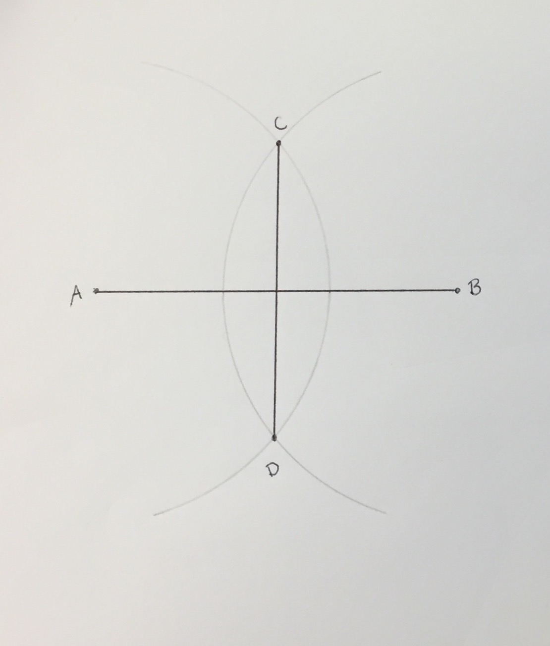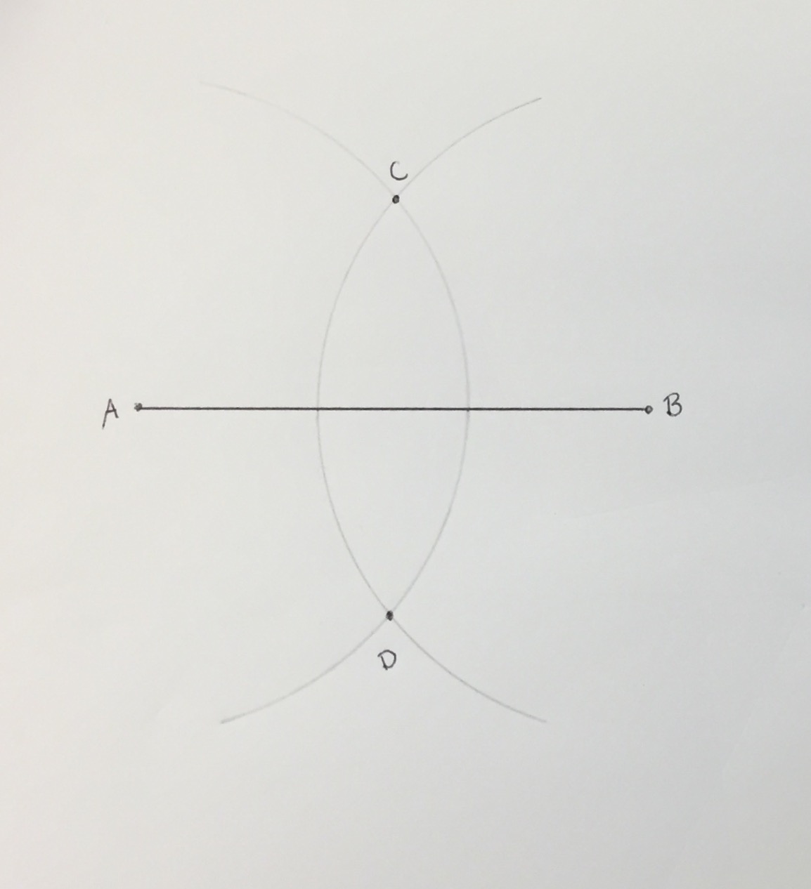 Call the points where these two matching circles cross C and D. Â Use a straight edge to connect C to D.