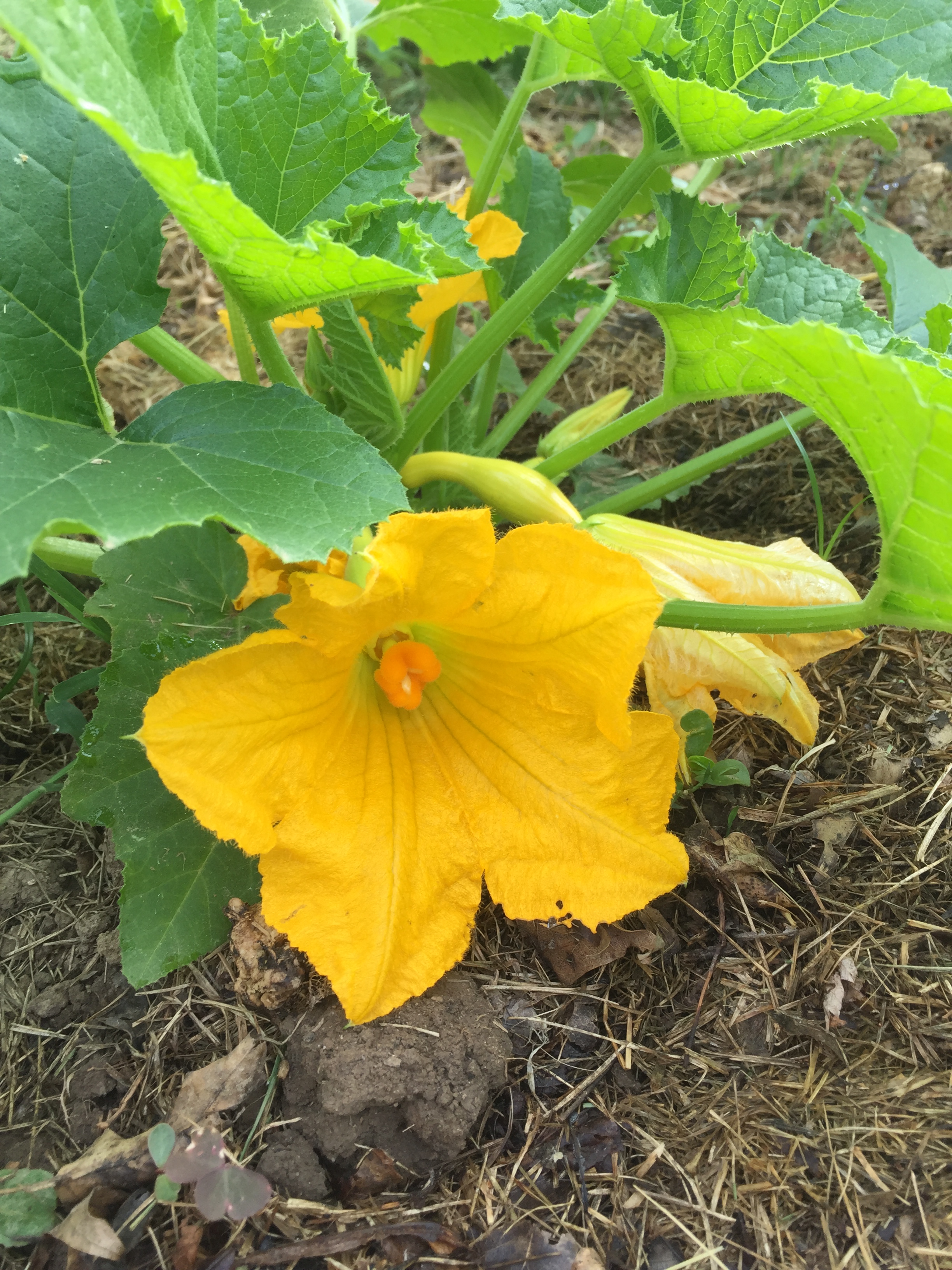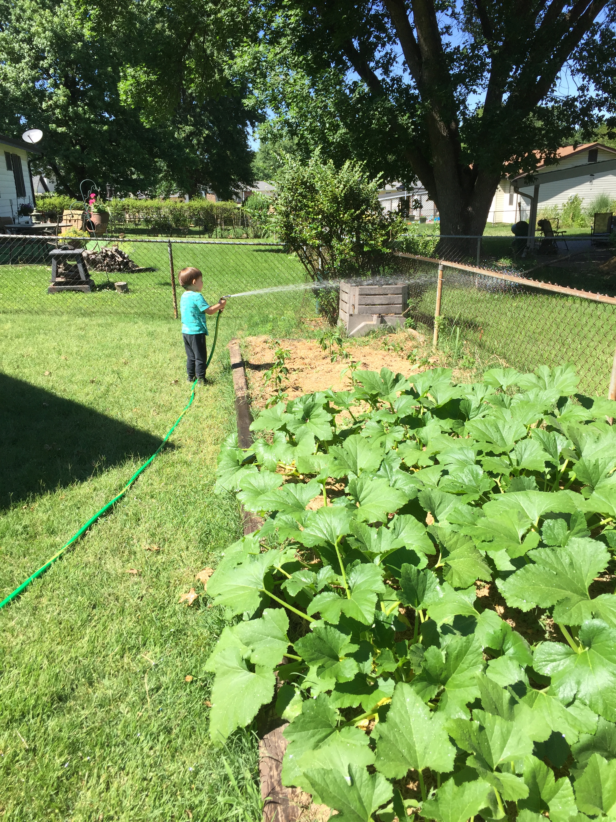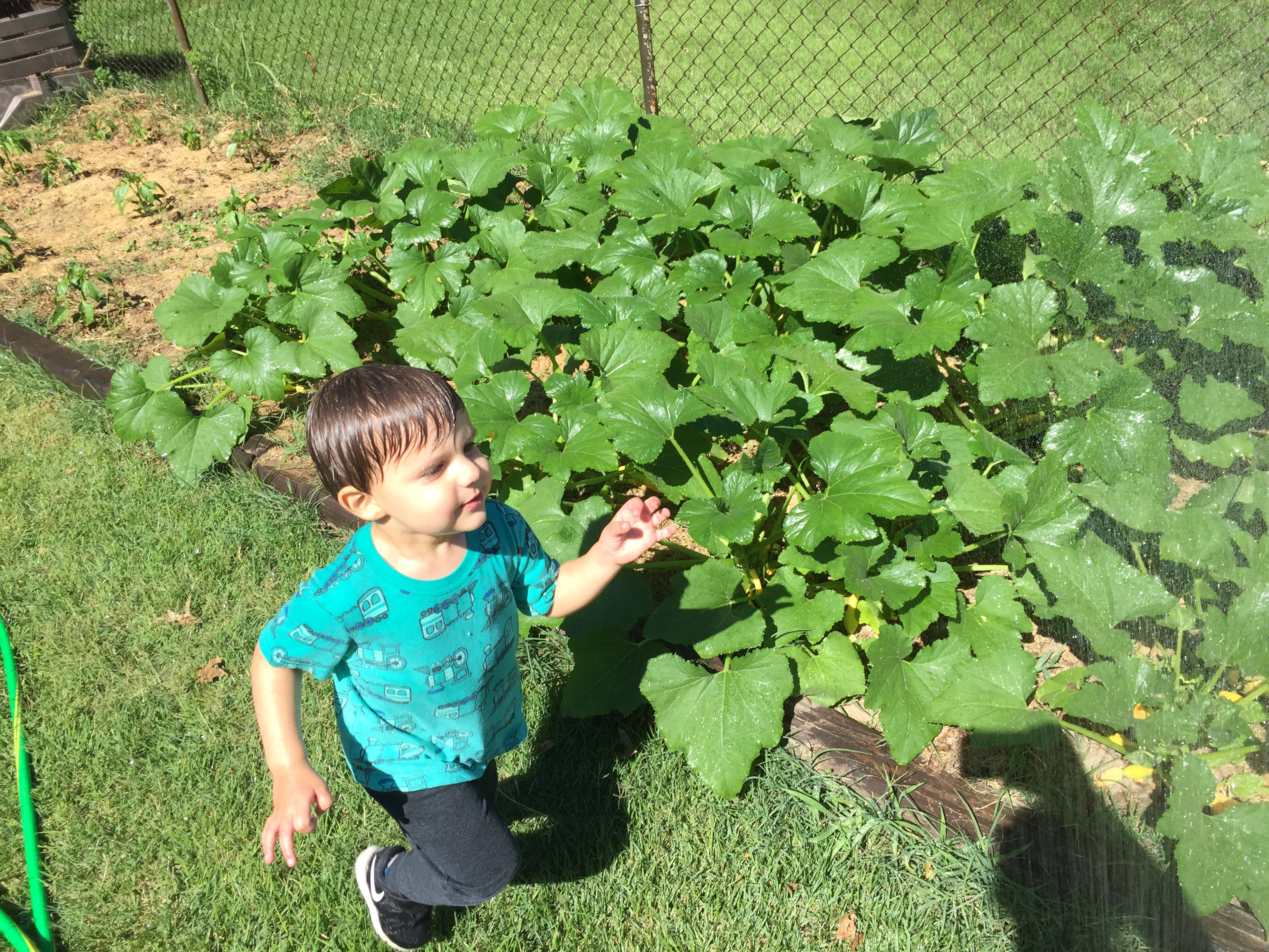 One of our big summer goals for this year has been keeping a vegetable garden. We tried last year but without much success (weeds, squash bugs, some kind of hex on our peppers…), so we are being more deliberate and conscientious stewards of our garden this year. In order to make it easier (and safer) for our older son to help out, we removed the chicken wire fence that was around the garden and placed the plants a little further apart so that he could walk between them to pull weeds. His main responsibility is watering, which he is loving! Nine times out of ten he ends up soaking wet, but so do the summer squash, so it’s working. The plants are super happy with this arrangement, as you can see, and they are loaded with blossoms.