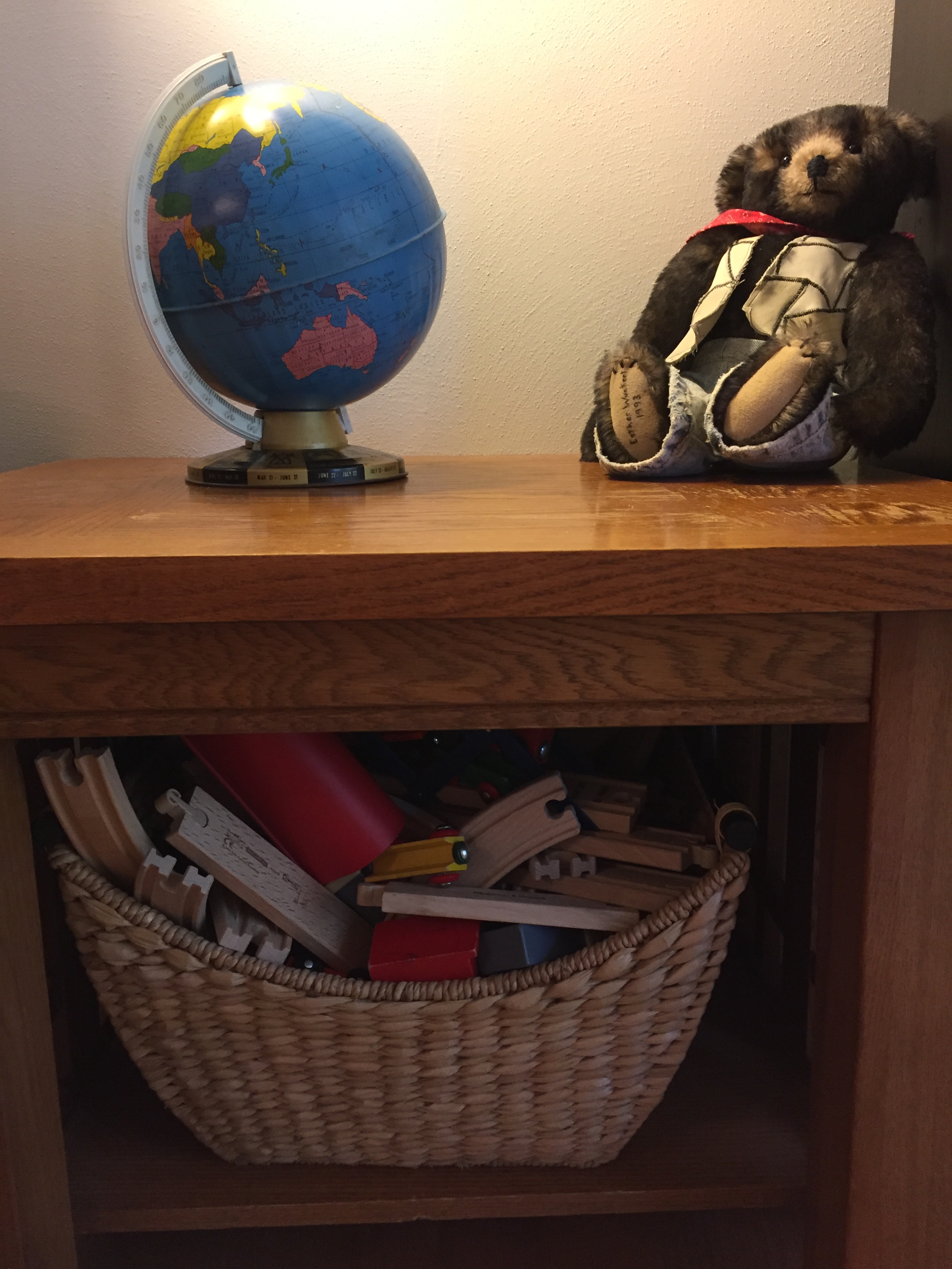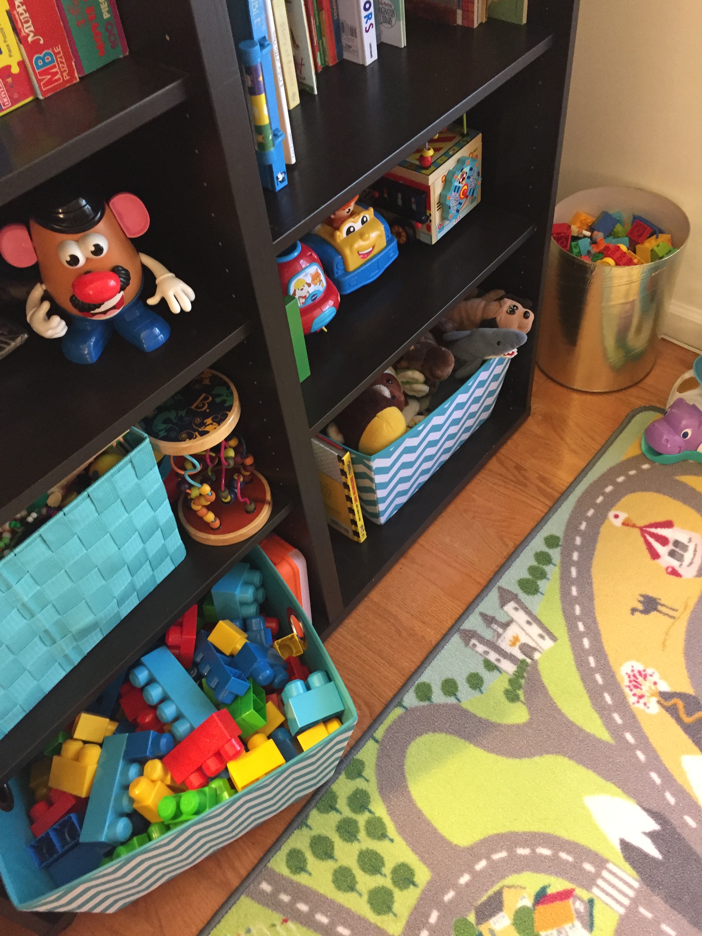 - A place for everything. We have a shelf for puzzles, a bin for stuffed animals, a basket for wooden trains, a bucket of Duplos, and so on. Toys get put back in their spot daily. If they start to outgrow it, it’s time to cull them. For example, we recently reached a point where we could not possibly cram one more stuffed animal in the stuffed animal bin. Rather than buy a bigger bin, we sifted them and donated a bunch.