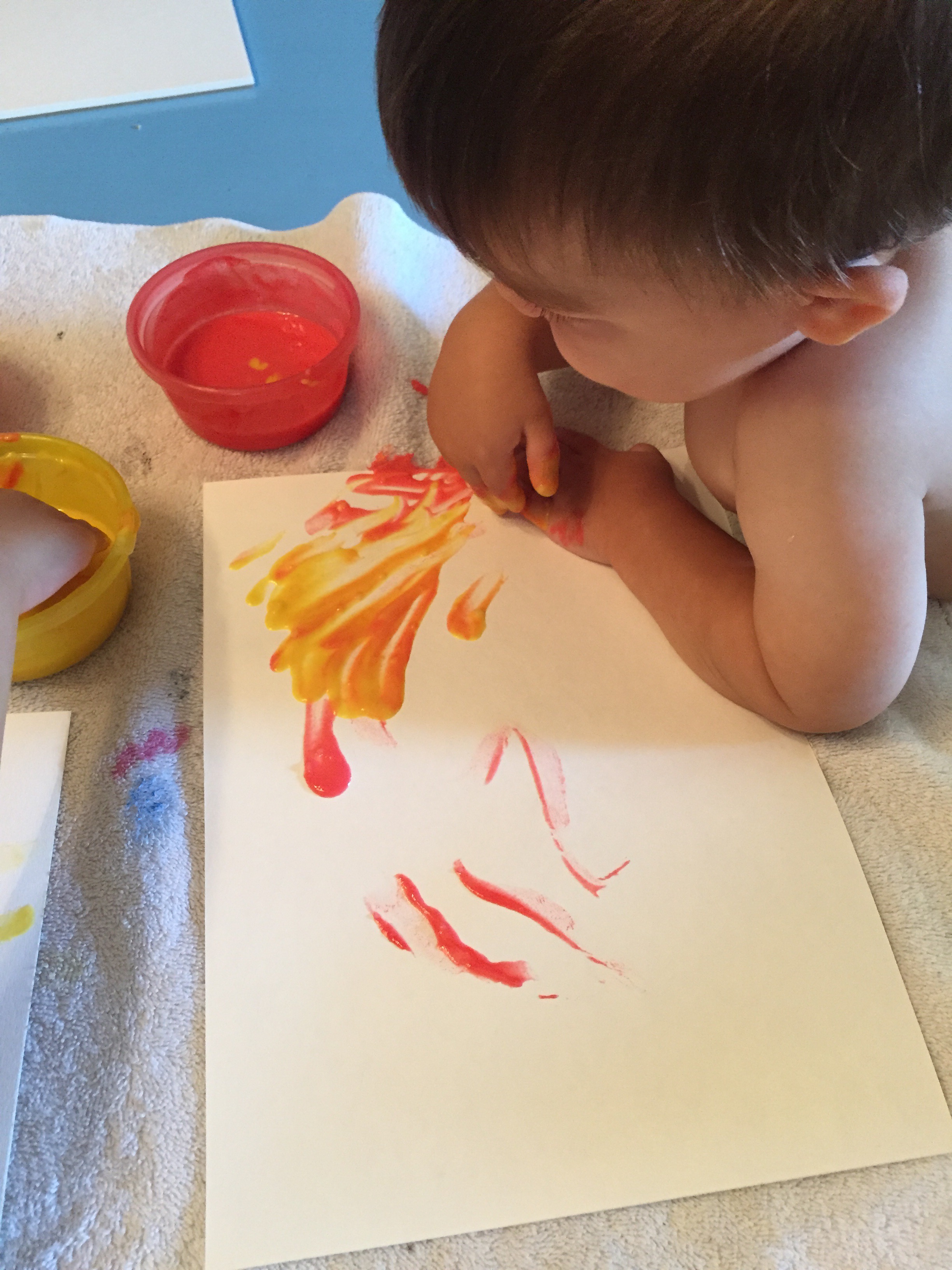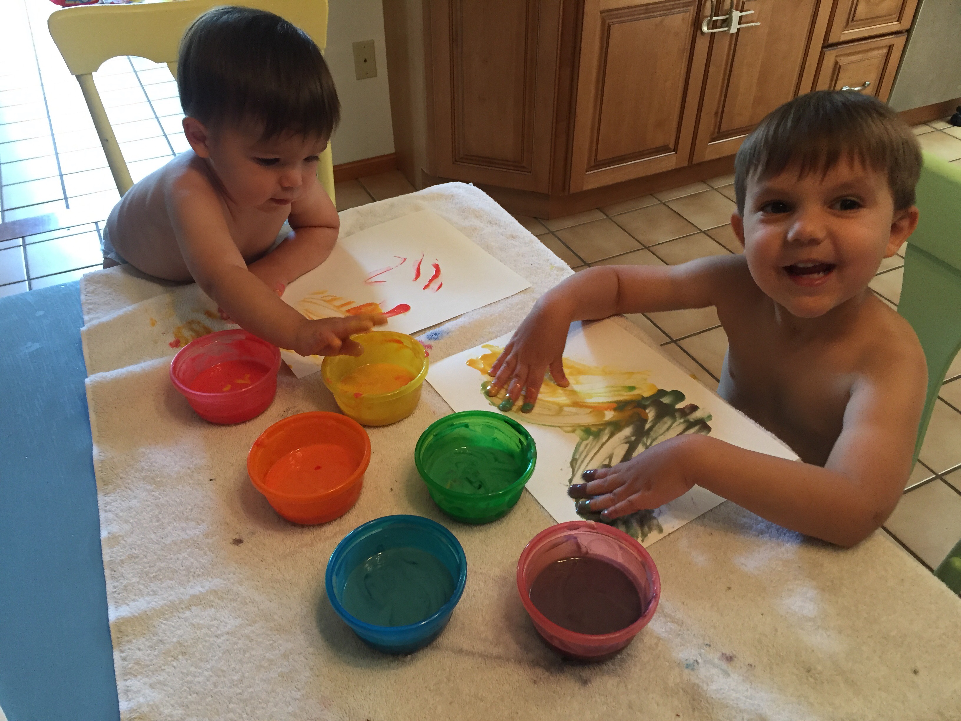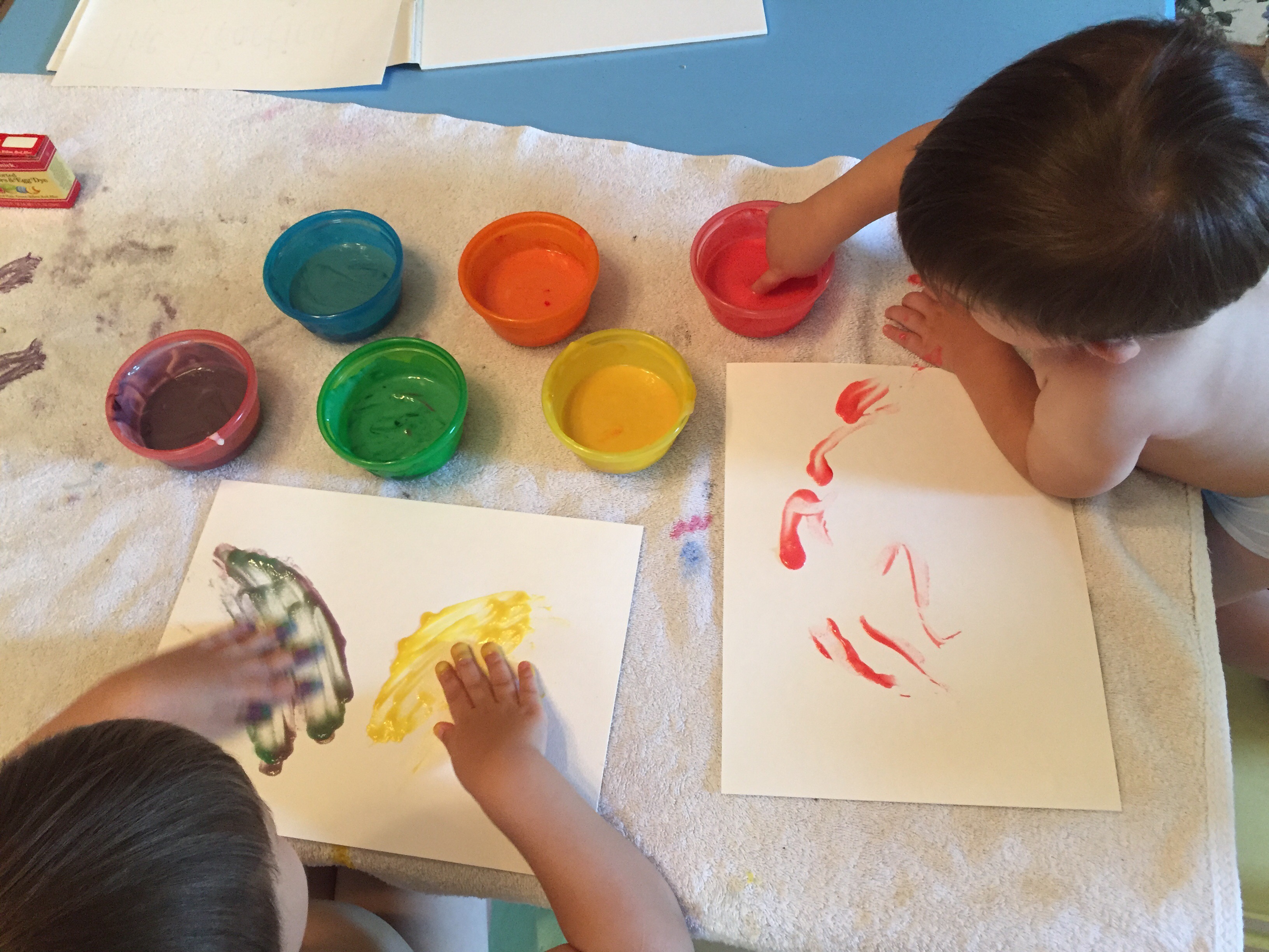 We experimented with homemade finger paint this week using this simple recipe from Tinker Lab. Most of the recipes I came across used water and sugar. We don’t usually have white sugar in the house, so I tried this one that uses flour instead. It was very easy to make and the kids enjoyed mixing in the food coloring once it cooled down. We made a double batch because finger paint just seemed like the kind of thing we’d need lots of. We were able to make about a half cup each of six different colors.