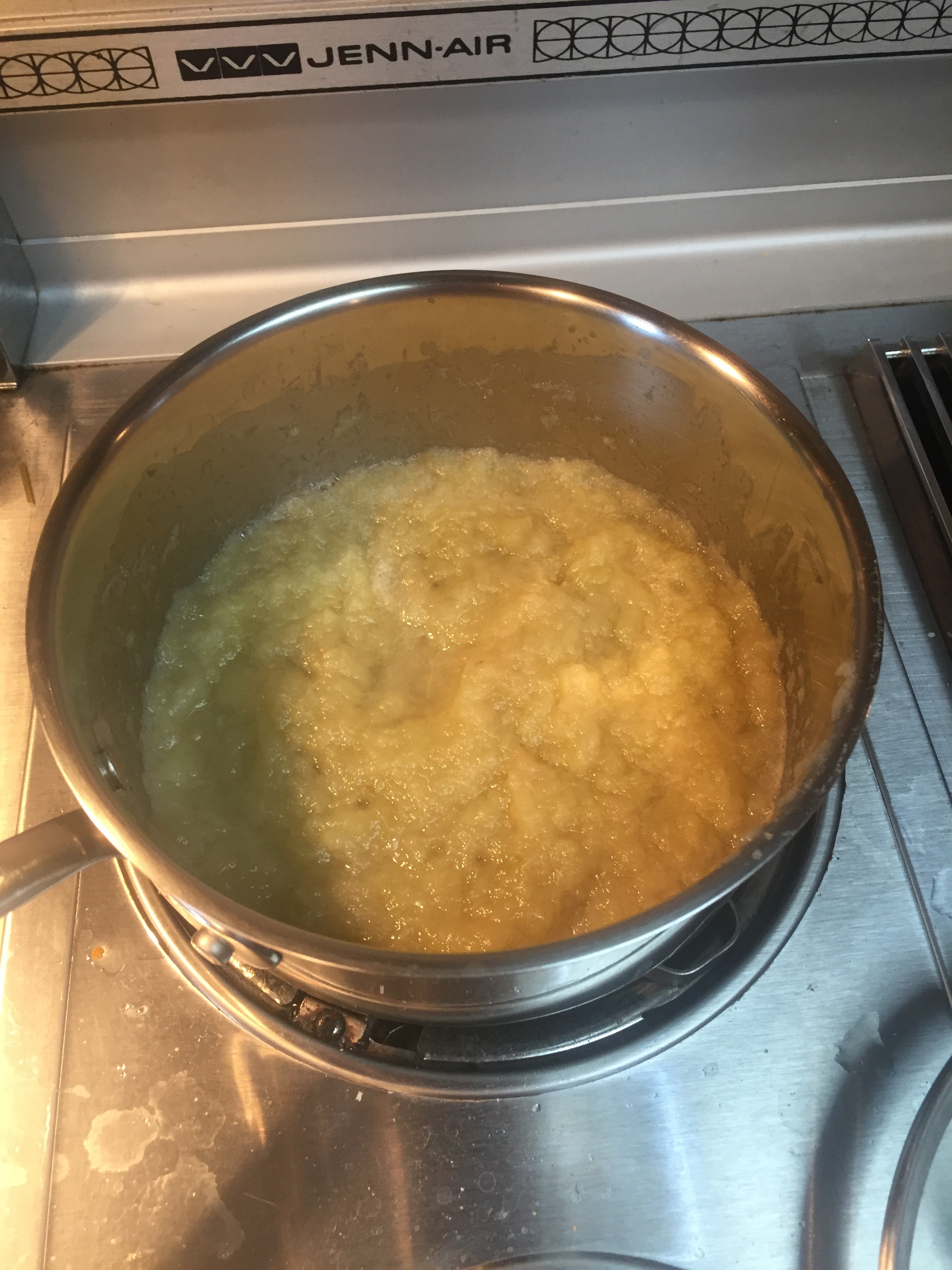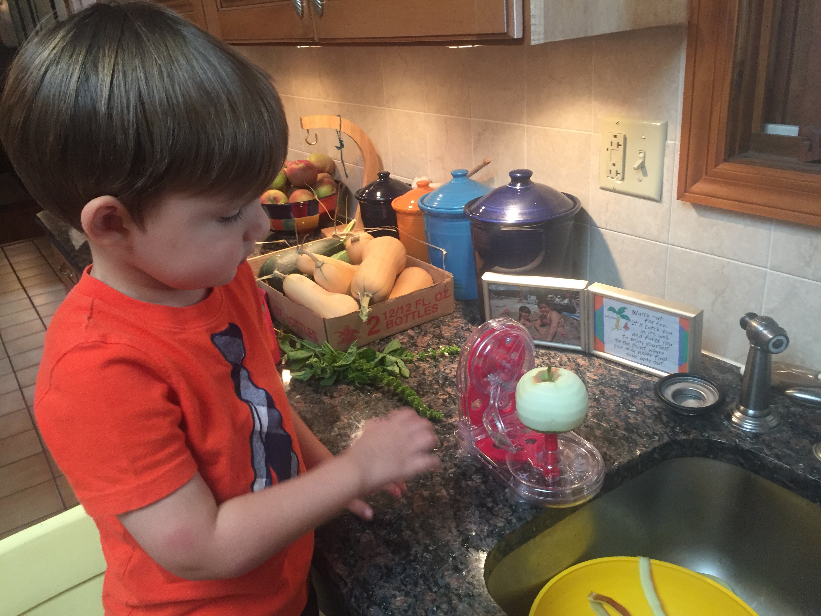 Thanks to a big crop of Mackintoshes from my parents’ house, we are up to our ears in apples at the moment. Just another great opportunity to get my three-year-old busy in the kitchen! Last week, he picked apples and made applesauce with my mom, so this weekend, I let him be the expert and show me how. He’s a pro at running that apple peeler, and we made quick work of about three dozen apples. Most I sliced and froze for future smoothies, but we also cooked a handful down into some homemade applesauce, a favorite around our house.
