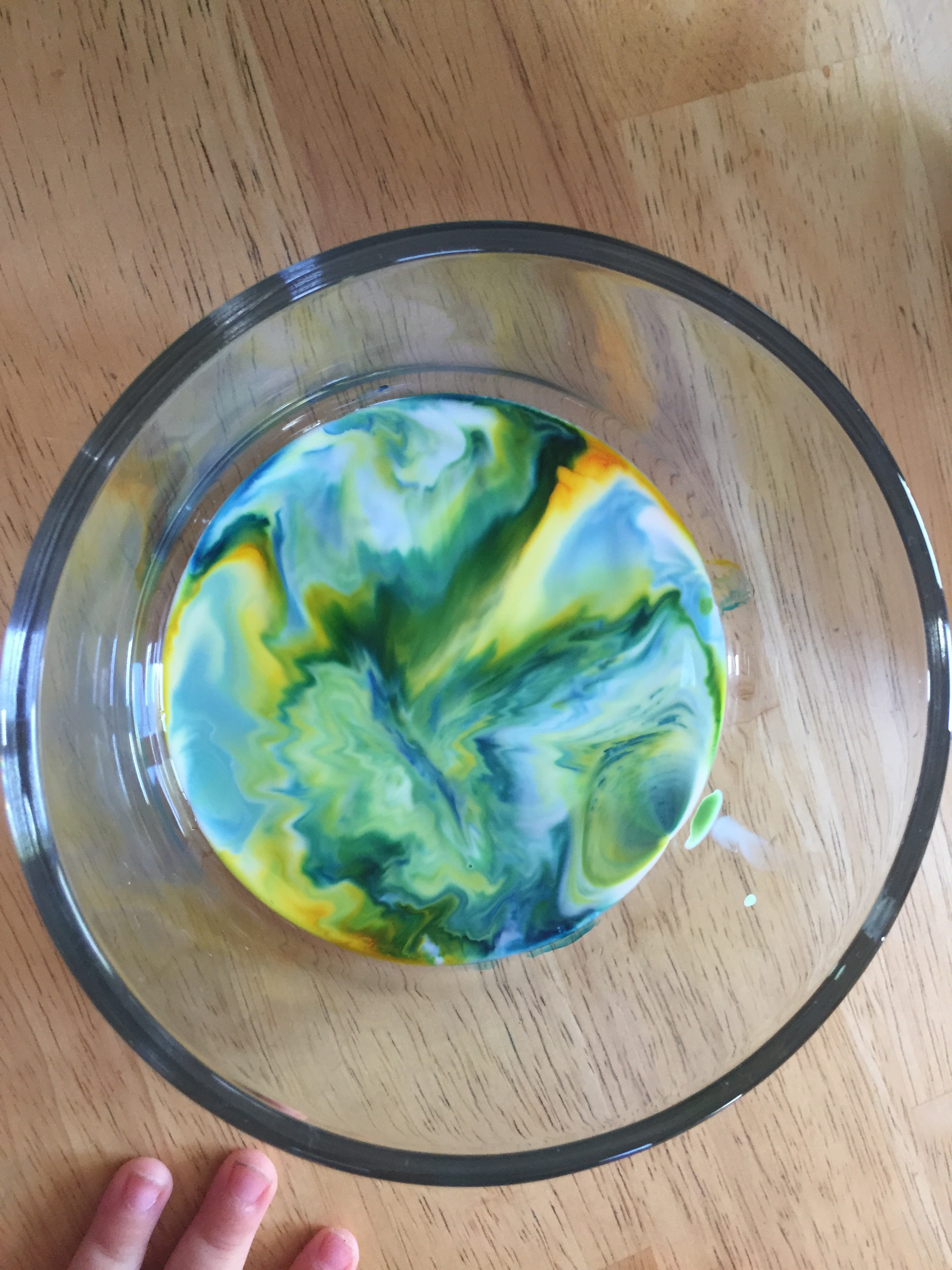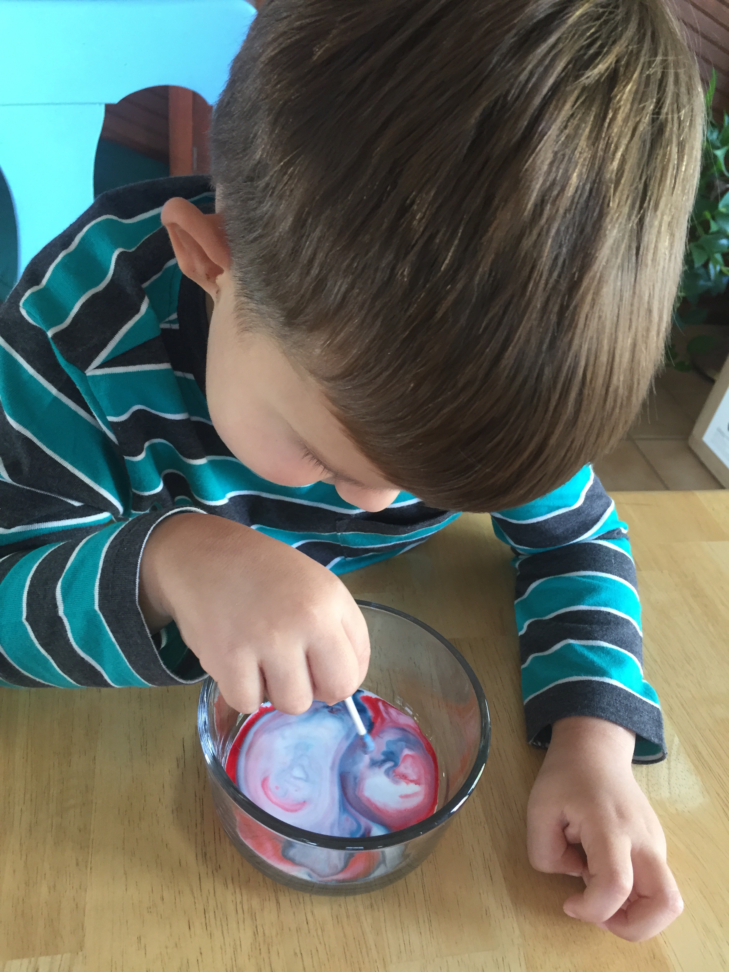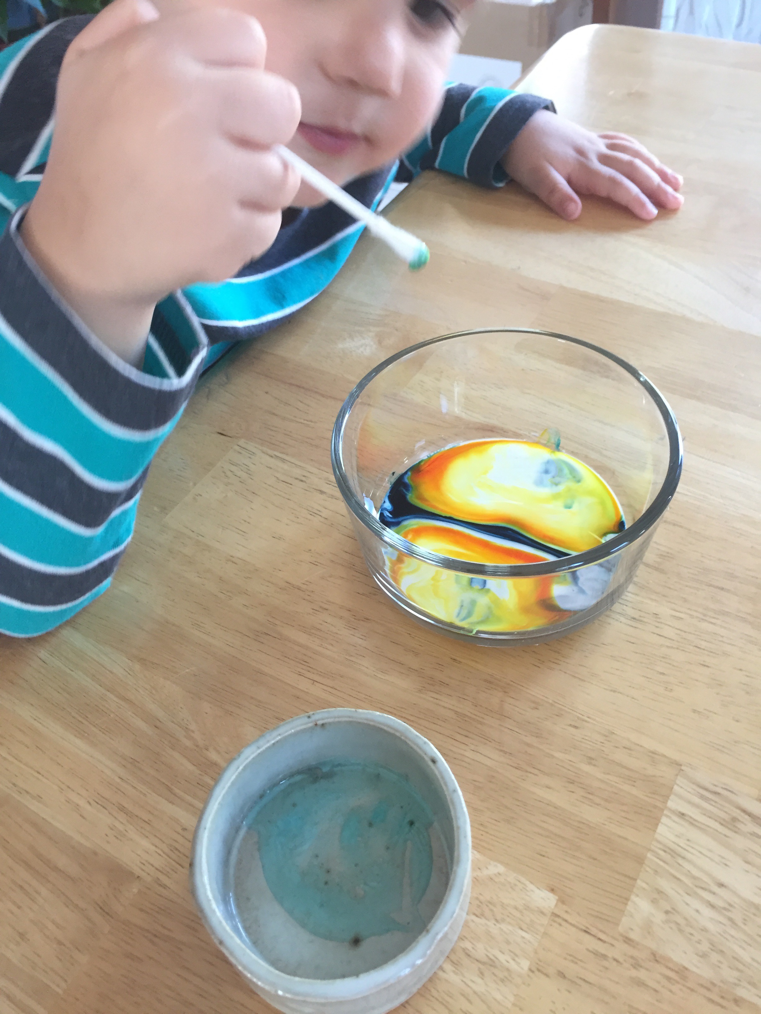 Notice that the drips of color — which are water-based — stay put. They don’t mix with the milk. (If your child doesn’t have much experience with seeing food-coloring react with water, you may want to try that on the side to contrast. My kid has lots of experience watching food-coloring in water because, well, #obsessed.)