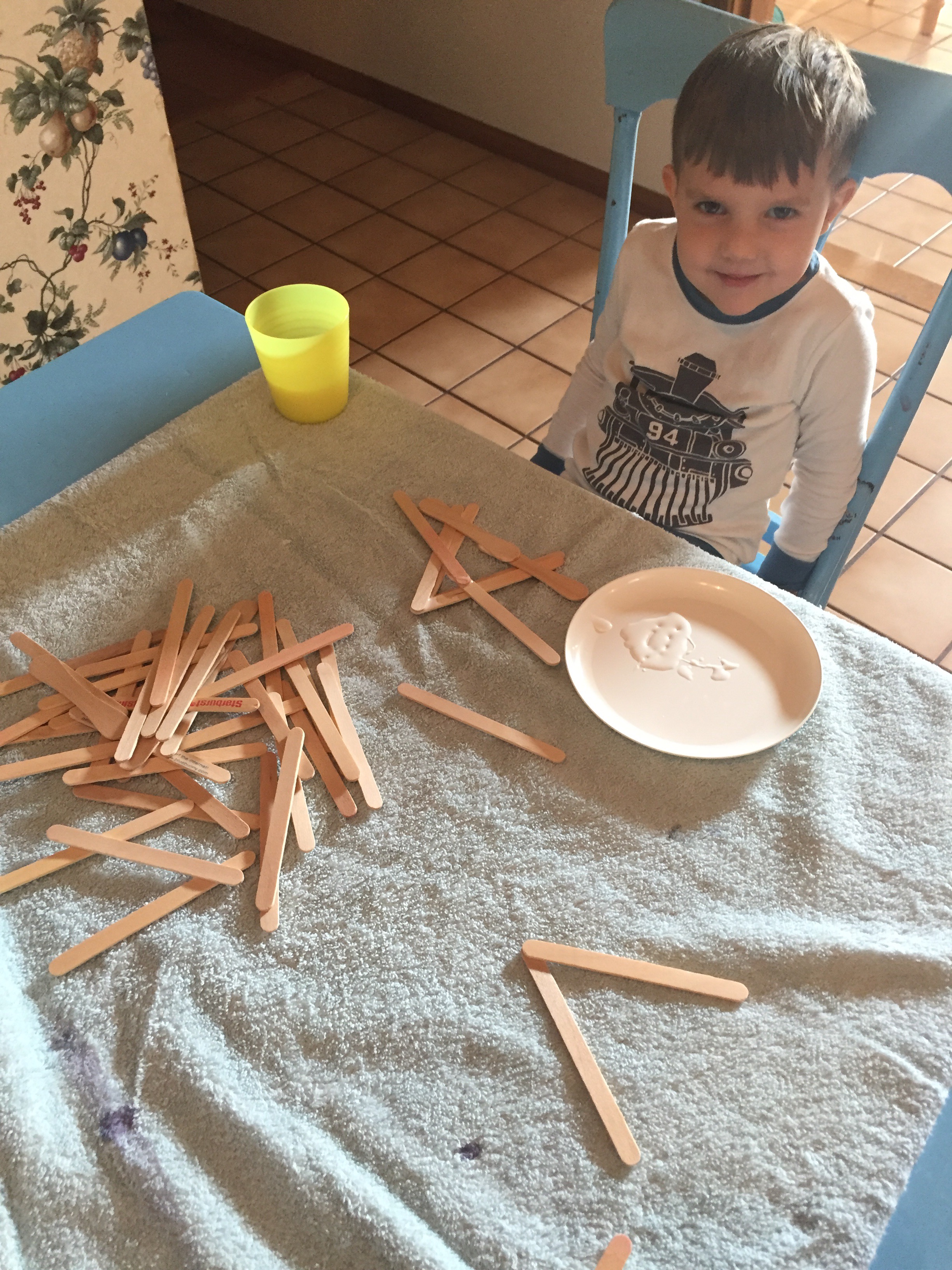 Once we were done constructing our snowflakes, we gave them a few hours for the glue to dry (during which time we obviously set up an obstacle course of couch cushions, visible in the background below). Then little man handled the painting pretty much on his own. I went back and touched up a few thin spots, but Popsicle sticks and craft paint are this guy’s jam.