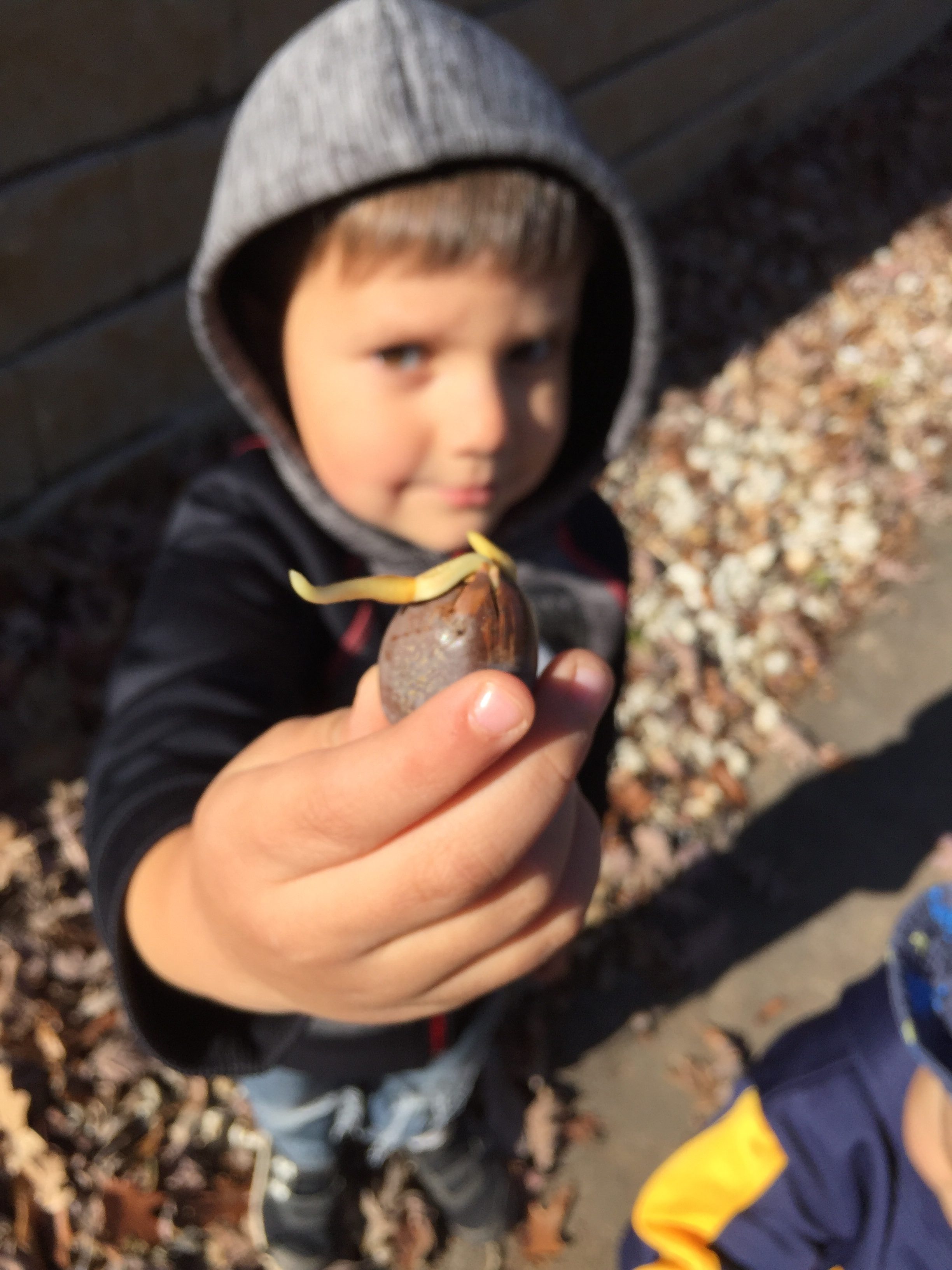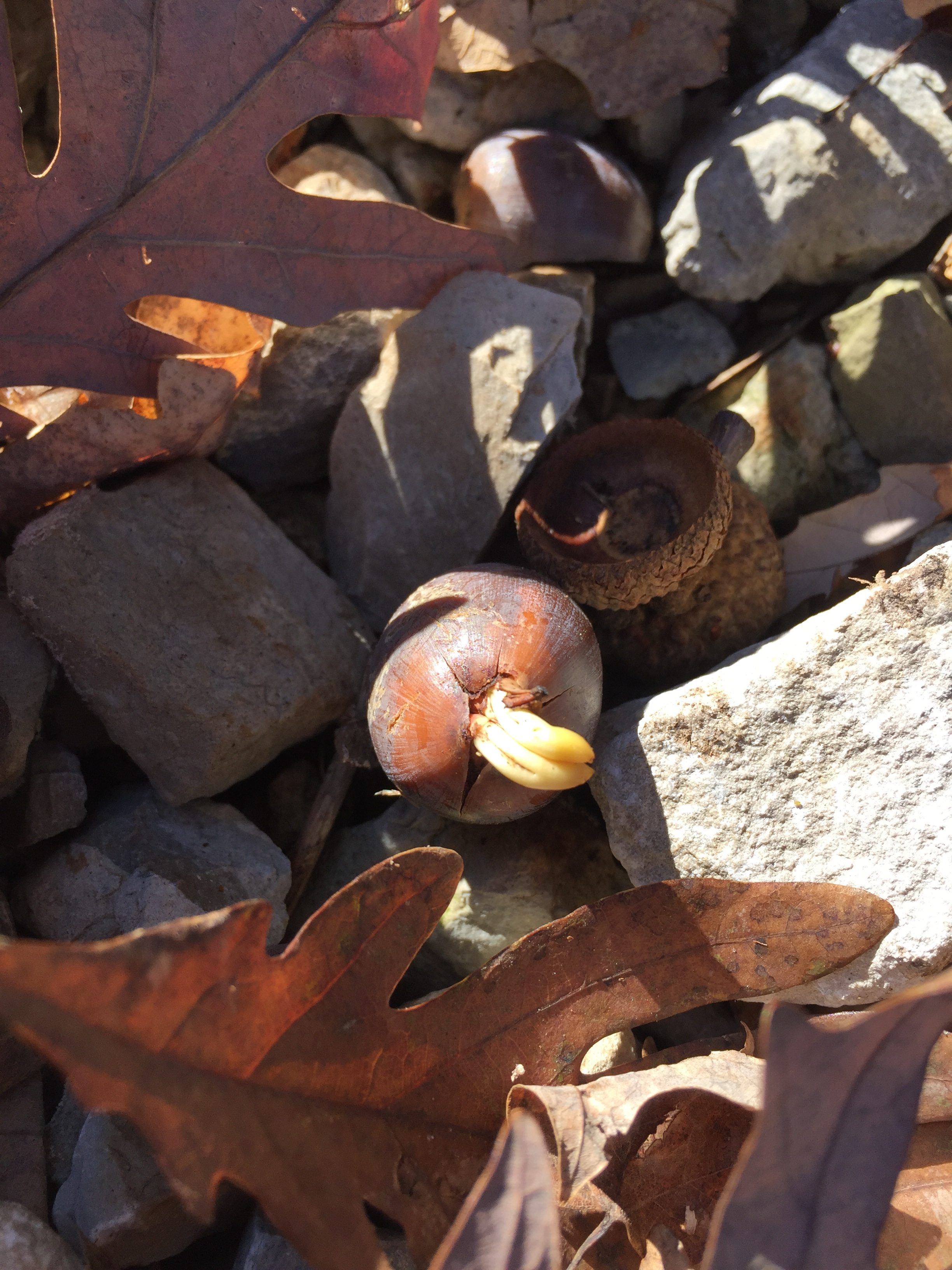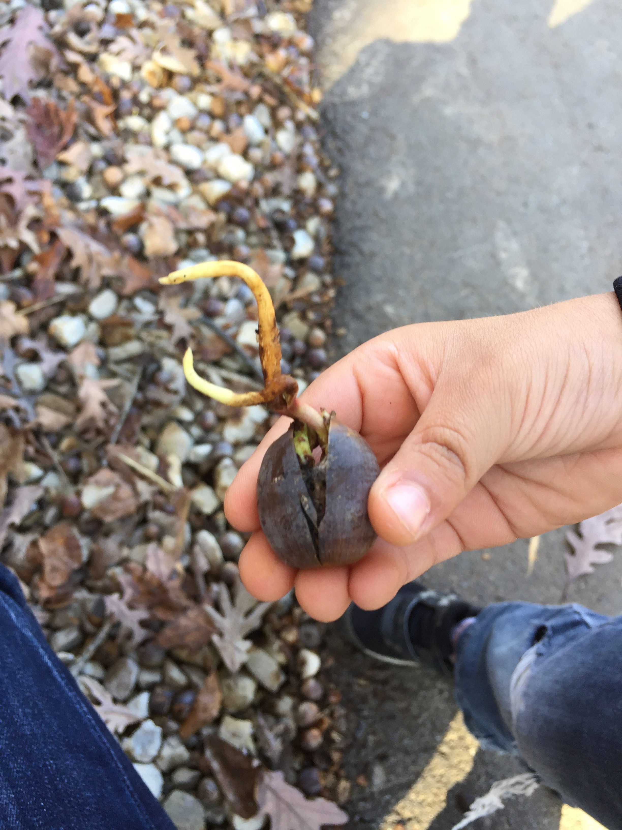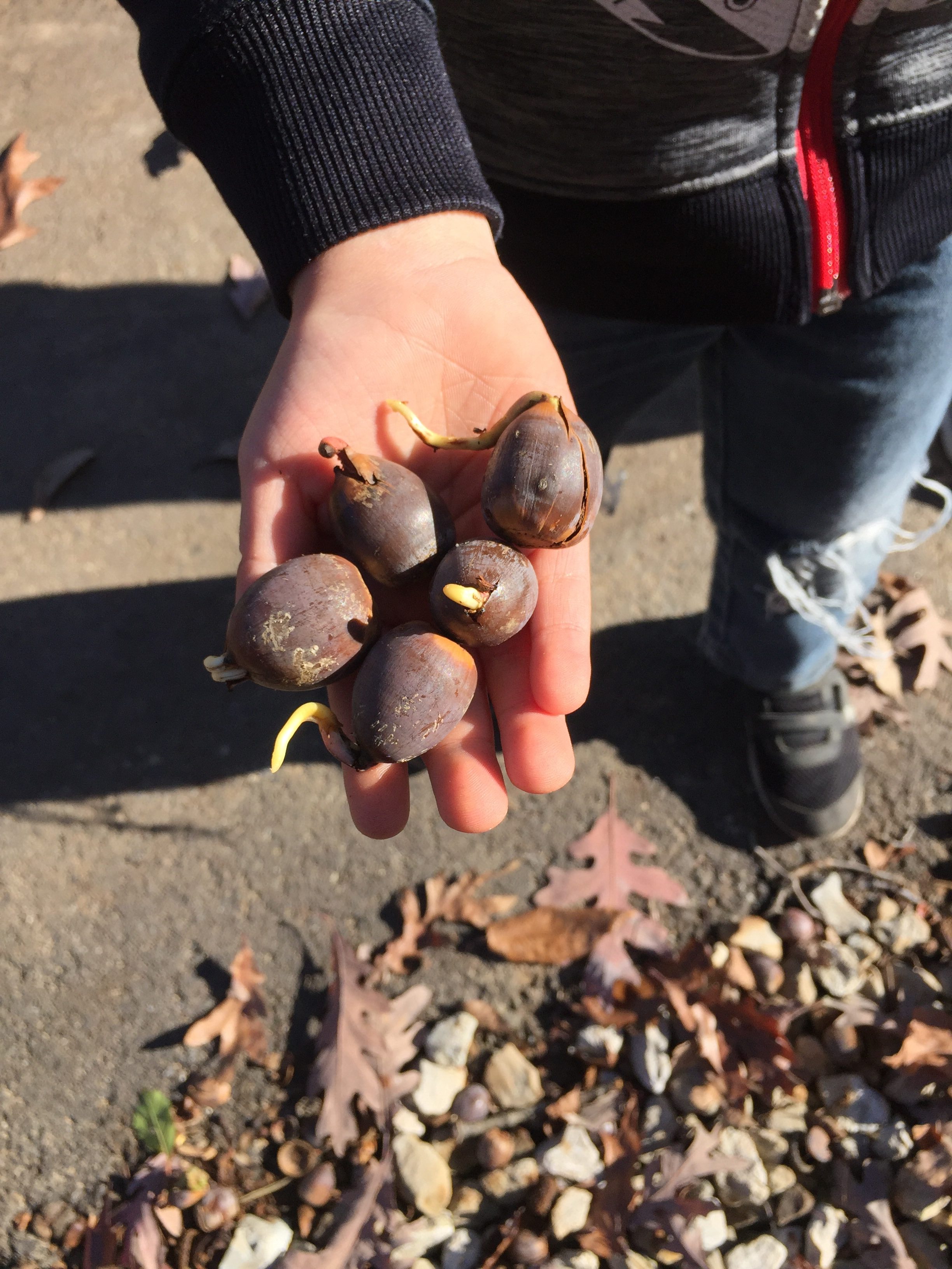 Several weeks ago, our neighbors’ oak tree started dropping tiny green acorns, and my guys were on it, diligently collecting them by the pocketful. Over time, the acorns turned brown and got bigger, and they naturally began a competition to see who could find the biggest acorn. Eventually, the boys started noticing a few cracked ones and splitting them open to see the nuts inside. In the park near our house, we discovered a rock bed along the trail that was littered with acorns. When we returned after a few days of steady rain, the same acorns were sprouting like crazy! As we collected them and tossed them out of the rocks onto better soil, we discussed all these questions: